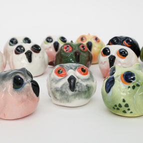 I hand-crafted base molds. With porcelain slip, I then use those molds to create the bases for these creatures. I then add sculptural elements, and hand paint to create unique creatures.